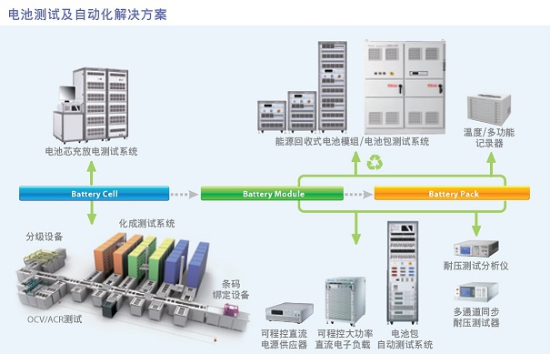 电池测试是一个十分复杂而且关键的过程,需要准确、精细、快速、可靠的测试设备和系统。而Chroma 电子所提供的电池测试方案,则具备全面性、多样性和先进性,能够帮助客户进行充电、放电、容量、效率、循环寿命、温度及安全性等方面的综合测试,并实现精确、实时、远程和批量的数据采集和分析。在这个复杂的测试过程中,使用了不同种类的仪器,包括电子负载、电压电流源、直流电源、电池测试仪及自动化测试系统等。