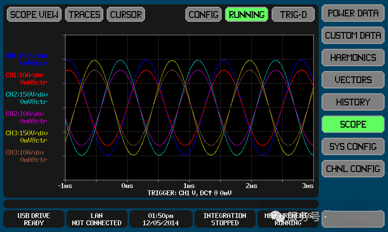 功率数据屏幕(图2)可一键显示任意选定通道或虚拟功率分析仪(VPA)组的V、A、W、VA、VAR 和 PF 数据,还能查看峰值读数、相位、CF 等参数,甚至可控制和查看集成数据结果(WHr)。