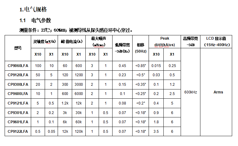 CP9000LFA系列采用双量程设计的低频柔性电流探头,是业界独创的示波器探头数显合二为一的探头。无需连接任何设备直接显示电流有效值,同时也可以连接示波器测量波形。可以实现宽广的电流测量范围,量程设计从60A120kA的测量范围,环中间保证精度1%,整个环内精度(环交界处除外)典型值2%带宽高达600kHz(700mm线圈周长)探头环本体外径典型值8mm,耐压值高达10kVpk,非常适合低频大电流,大功率测试场合。其主要特点包括:线圈轻巧柔软且可以自由插拔,可以探测到许多硬制探头无法达到的地方,轻而易举的实现与被测对象连接;插入损耗几乎为零,仅为几个皮亨,对被测对象近乎为零的干扰;标准的BNC输出接口,很方便实现与示波器,数据采集器,数字电压表等连接,观测电流波形;业界独创的电池和 USB 双供电,使用更加灵活方便;过流报警功能,更具人性化设计;LCD的显示精度高达 位半,可显示 15Hz400Hz 有效值。