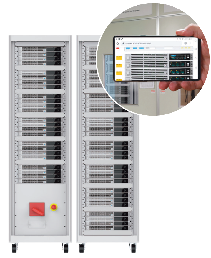 采用高功率密度之电源设计实现1U机框内可3信道1.7kW输出,各别通道具隔离设计可独立电压/电流控制及测量,此可节省系统整合柜体之空间配置及简化配线,举例应用:以下原为系统整合制造商于设备上所需的9台直流电源供应器规格,相较于其它方案须9台单通道电源,配置高度9U;使用62000E系列电源进行规划仅需3台,高度总和3U即可符合(规划使用3信道机种)。