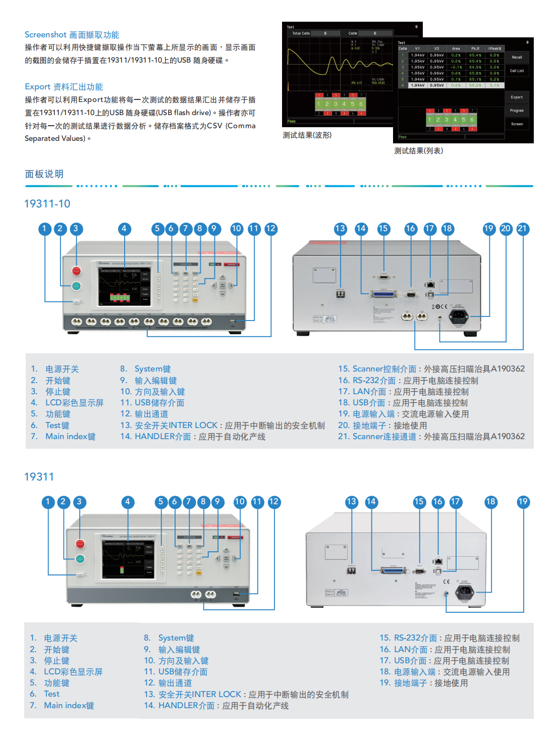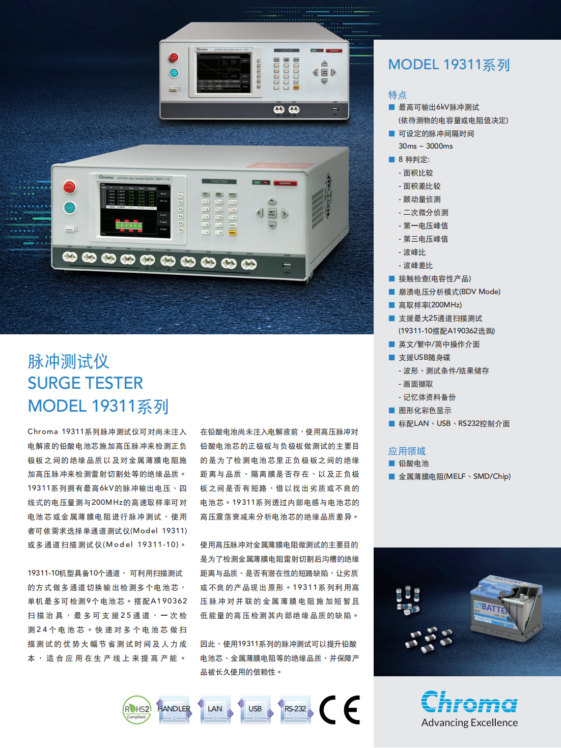 Chroma 19311系列脉冲测试仪可对尚未注入电解液的铅酸电池芯施加高压脉冲来检测正负极板之间的绝缘品质以及对金属薄膜电阻施加高压脉冲来检测雷射切割处等的绝缘品质。