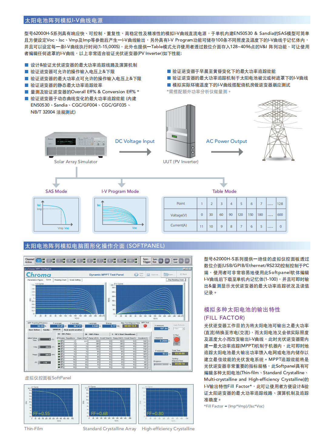 62000H-S系列具备16bit高解析度的数位控制及精准的电压及电流量测机制,并搭配图形化操作软体(Softpanel),此可即时地测试及显示光伏逆变器的最大功率追踪状况,且测试MPPT EFF%读值,另外使用者可选择欲储存的量测读值于软体上。