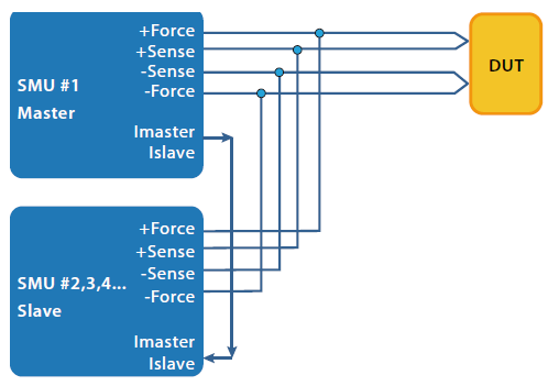 电流共享是将其中一通道在供电压-测电流(FVMI)模式下设为主控单元(Master),其他通道则需设为供电流-测电压(FIMV)模式,主控单元的输出电压值设为量测应用需要的电压值,而其电流值为其他单元在供电流-测电压模式下之设定电流。右图为在主从控制控模式下,单元并联方式的示意图。