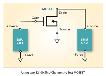 如右图所示,52400系列电源量测单元通道1的输出端Force Hi(+Force)连接到MOSFET的闸极,电源量测单元通道2的输出端+Force则连接到MOSFET的汲极。 MOSFET的源极则与电源量测单元通道1与通道2的Force Lo(-Force)端点连接。改变各通道之电流与电压的输出值,即可扫描绘出待测物之各项I-V特性曲线图。