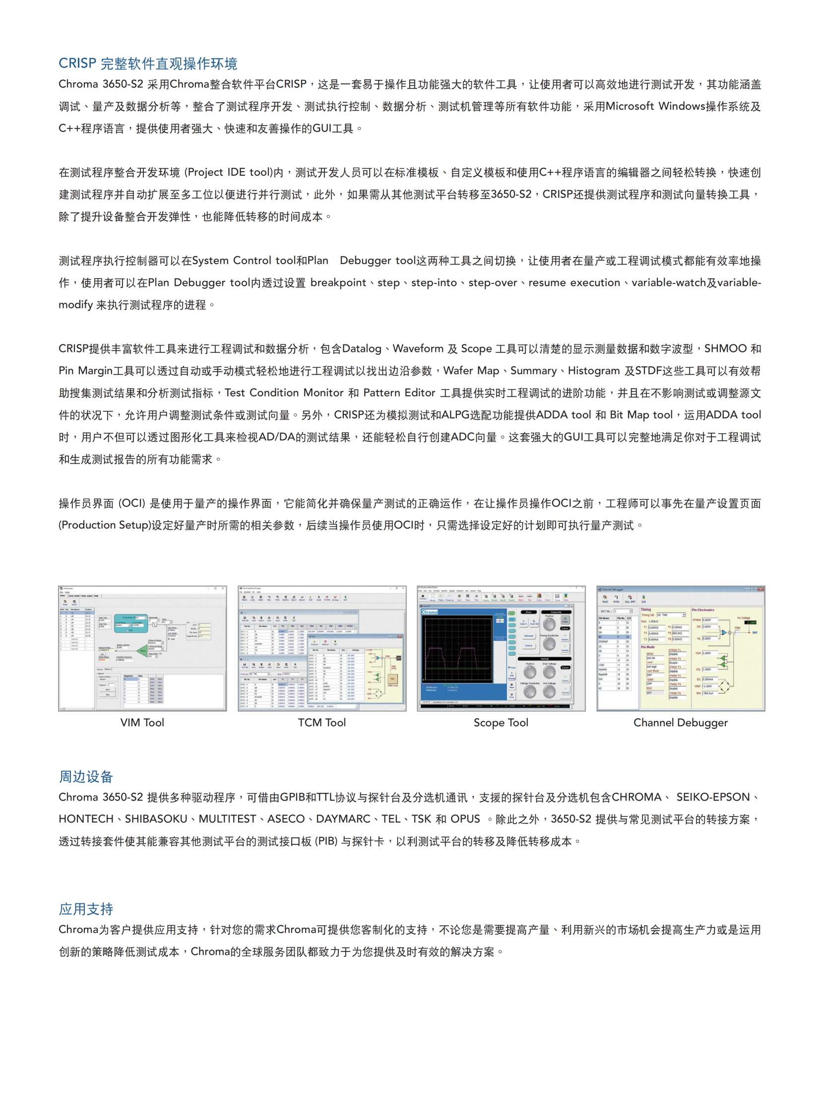 3650-S2测试系统具备完整的测试功能、高精准度、强大的软件和出色的可靠性,是测试高性能MCU、模拟芯片、消费性SoC的理想选择,同时,凭借高产出和高并行的测试能力,3650-S2可为芯片设计公司、IDM和测试厂提供高性价比解决方案。
