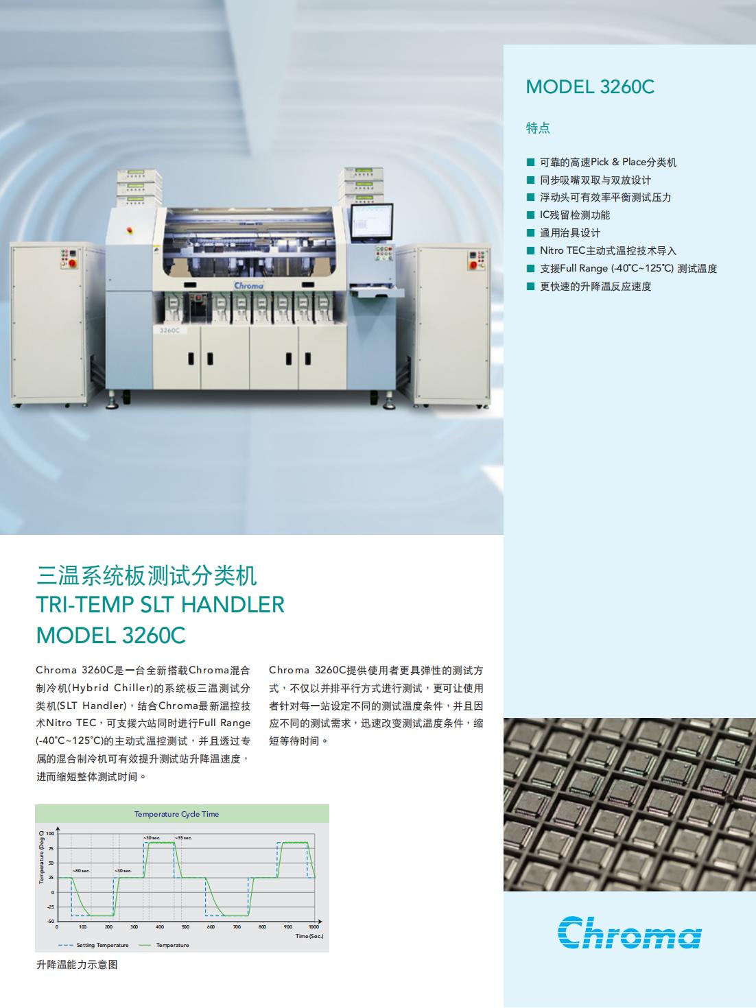 Chroma 3260C是一台全新搭载Chroma混合制冷机(Hybrid Chiller)的系统板三温测试分类机(SLT Handler),结合Chroma最新温控技术Nitro TEC,可支援六站同时进行FullRange(-40℃~125℃)的主动式温控测试,并且透过专属的混合制冷机可有效提升测试站升降温速度,进而缩短整体测试时间。