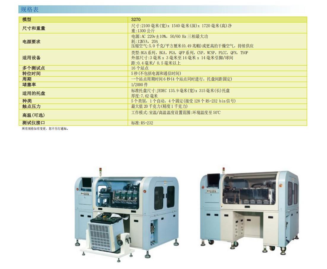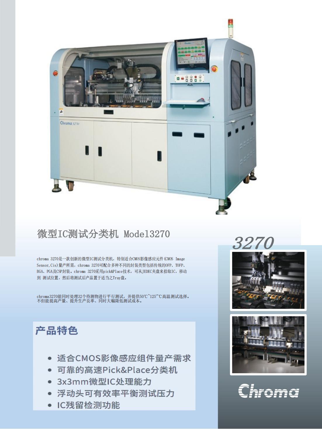 chroma 3270是一款创新的微型IC测试分类机,特别适合CMOS影像感应元件(CMOS ImageSensor,Cis)量产所需,chroma 3270可配合多种不同的封装类型包括传统的OFP、TOFP、BGA、PGA及CSP封装。