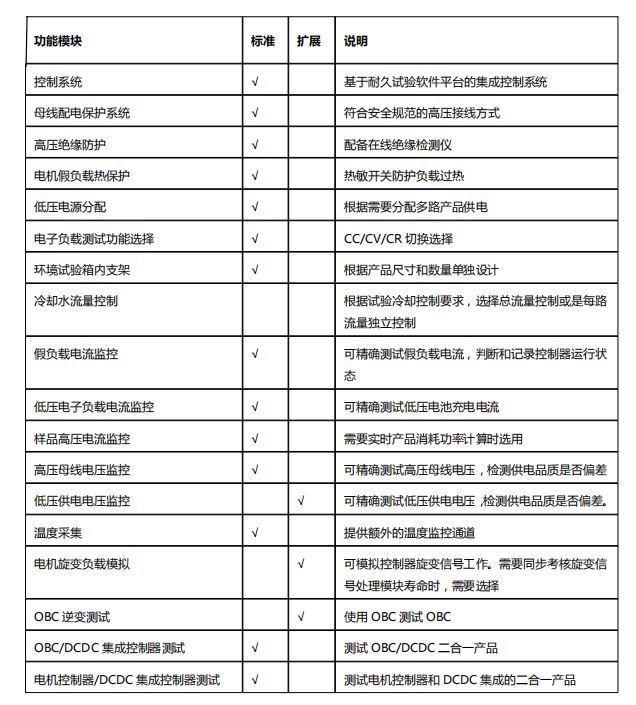 样品环境:所有产品放置在环境温度箱中进行环境模拟,连接线束和冷却水路穿过温度箱壁; 高压电池:使用高压电源模拟电池放电,高压电子负载模拟电池充电; 低压电池:电子负载模拟给低压电池充电的过程,电池供电功能由低压电源完成; PC为基础的仪器通讯系统、指令分配执行系统、数据采集和记录系统; 安全继电器组成的紧停系统和硬件保护系统。 环境模拟